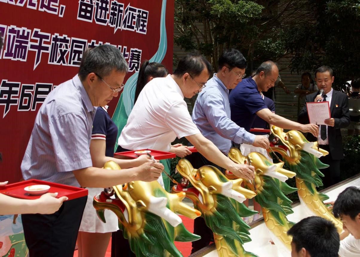 “点睛仪式”是龙舟比赛的传统仪式,校党委书记蒋永文、副校长蔡金红、体育学院党委书记华致雄、刘坚教授共同为龙点睛。