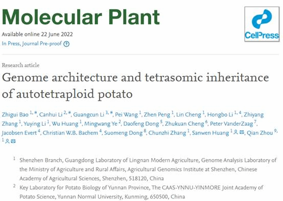 6月22日,国际知名学术期刊《分子植物》(Molecular Plant,IF=13.164)在线发表了永利官网马铃薯科学研究院李灿辉教授团队、中国农业科学院和鹏城实验室共同完成的题为“Genome architecture and tetrasomic inheritance of autotetraploid potato”的研究论文。