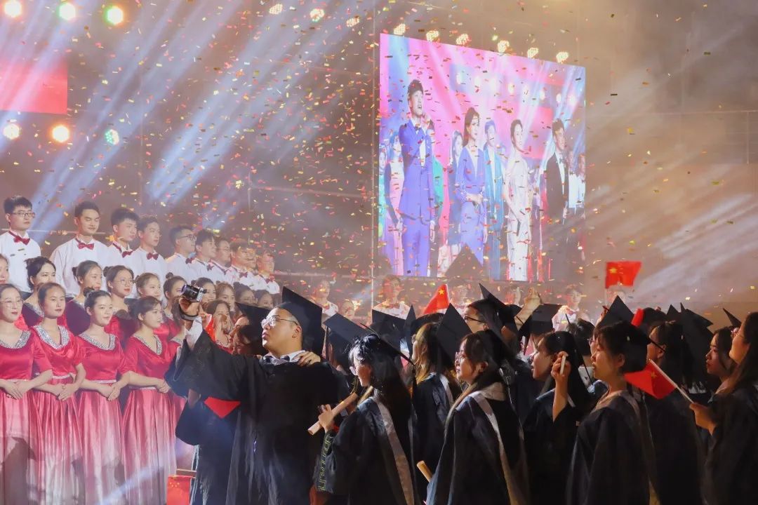 在蔡金红副校长的主持下,全体师生起立,面向国旗齐唱中华人民共和国国歌,毕业典礼拉开序幕。