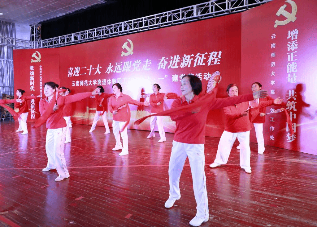 活动中,云南师大老年大学各专业班向大家展示了自己的学习成果,表演由合唱《四渡赤水出奇兵》、琵琶独奏《草原英雄小姐妹》、柔乐球表演《强军之歌》、中阮合奏《金蛇狂舞》及《喜洋洋》、太极拳表演八式太极拳及八法五步、舞蹈《赞歌》、柔力球表演《共筑中国梦》等组成,学员们的精彩表演,充分展现了学校不断提高广大离退休教职工的文化素养和身心健康水平,实现“夕阳无限好,人间重晚晴”的靓丽美景。