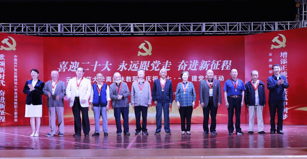 会上,校党委副书记张玮致辞,他首先向获得中共中央“光荣在党50年”纪念章的离退休教工党员致以崇高的敬意和诚挚的祝贺,向学校全体离退休教职工致以诚挚的问候。张副书记指出,各位老党员长期受党的教育,理想信念坚定,思想政治觉悟高,领导经验丰富,学科专业底蕴深厚,服务师生能力强,培养人才水平高,是学校发展的巨大资源宝库和重要支柱力量。希望广大离退休党员牢记初心使命,永葆政治本色,继续发挥政治优势、经验优势和威望优势,一如既往地关心支持学校各项事业发展,带头为广大青年党员、干部师生讲好党的故事、革命的故事、英雄的故事,使党的好传统、好作风发扬光大、代代相传,把西南联大爱国精神、刚毅坚卓的校训品格和云南师大的优良传统传承好、弘扬好。