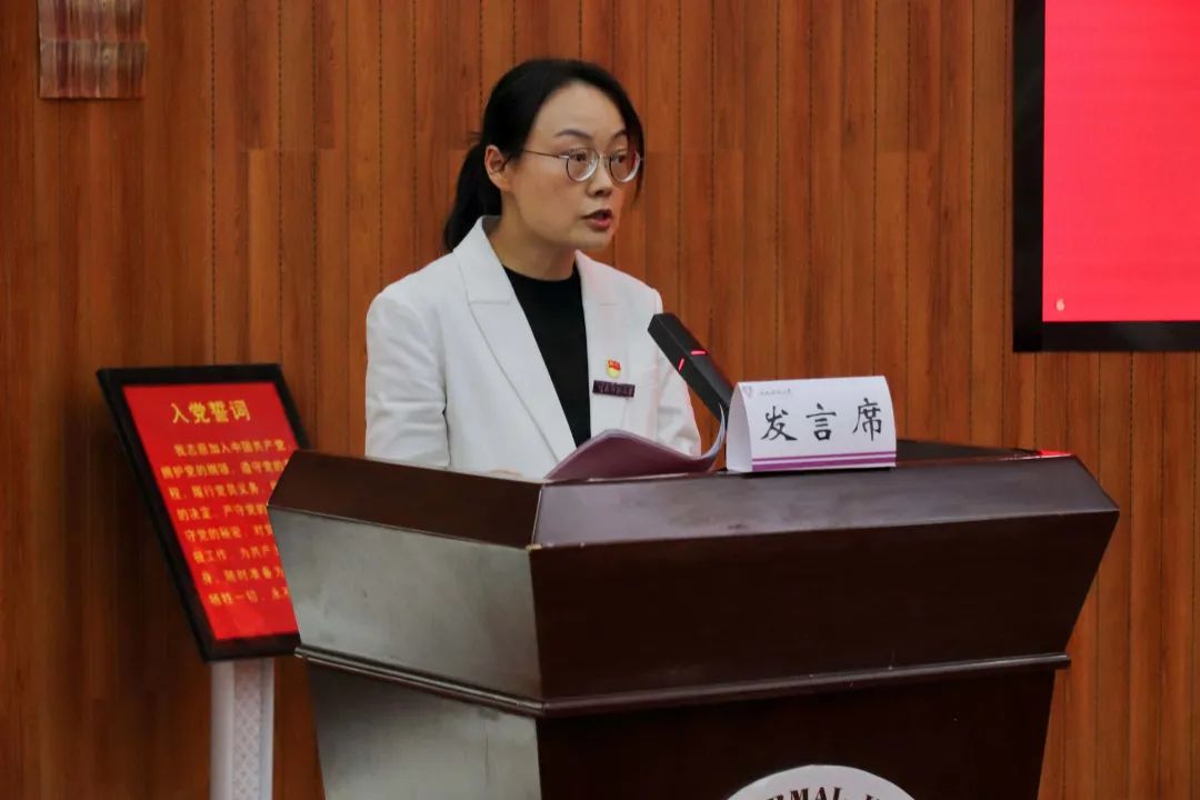 外国语学院党委教工第一党支部书记杨霓在发言中分享了外国语学院教工第一党支部以“党建+”模式,不断探索教师党支部工作方式方法。杨霓表示,作为一名学校基层党务工作者,今后将进一步发挥模范带头作用,不断增强党支部的凝聚力、战斗力,以立德树人为己任,为培养堪当民族复兴重任的时代新人做出应有的努力。
