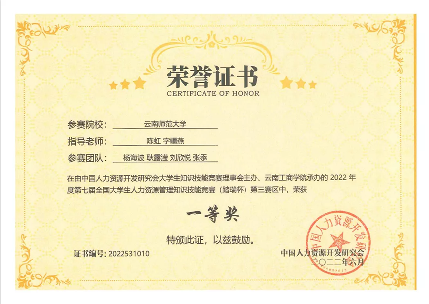 近日,第七届全国大学生人力资源管理知识技能竞赛(踏瑞杯)本科组西南赛区比赛在线上顺利进行,来自云南、贵州、四川和重庆的诸多高校参与比赛。yL23411永利官网登录教育学部本科生杨海波、张忝、耿露滢、刘欣悦四位同学组成队伍参赛,教育学部陈虹老师、字疆燕老师担任指导老师。