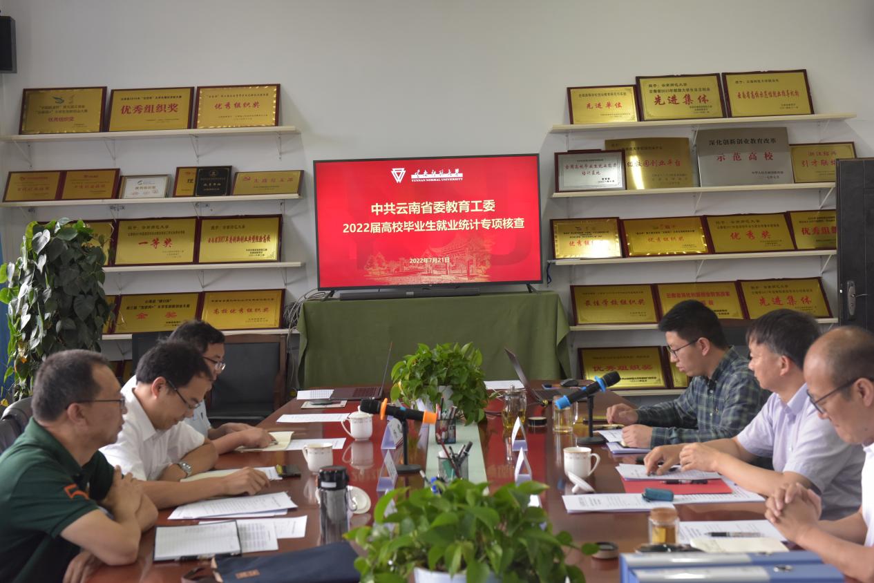 7月21日上午,由曲靖师范学院就业中心主任蒋成飞、云南交通运输职业学院招就处处长杨进、省教育厅教师工作处四级调研员栗青青、省高校毕业生就业工作专班成员雷蕾、昆明理工大学津桥学院学生工作处何鸿一行5人组成的第六考核组到永利官网核查2022届毕业生就业统计专项工作。学校党委副书记李宏、就业处相关负责人及工作人员、各学院(部)党委副书记、辅导员和班主任代表参加了核查会。