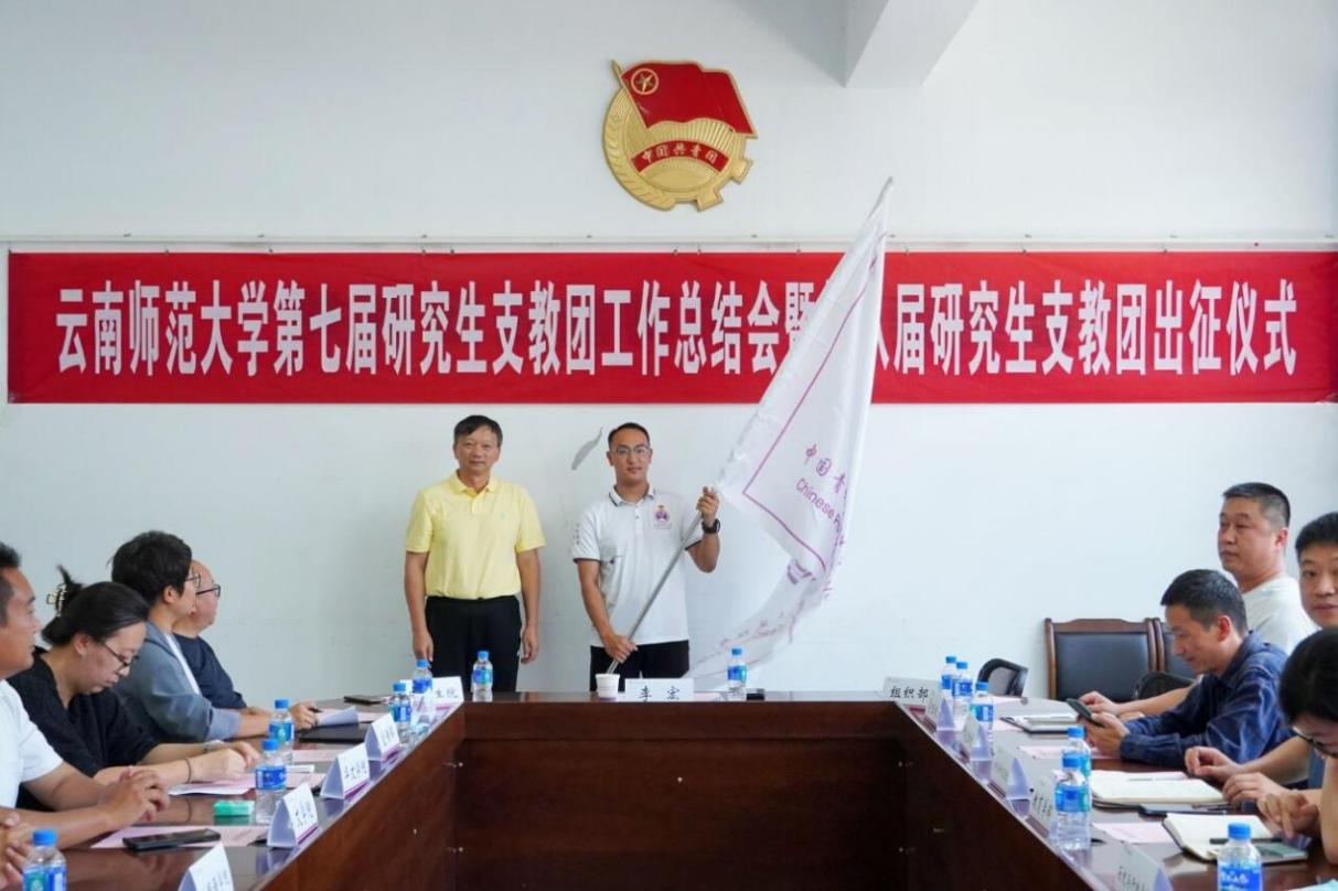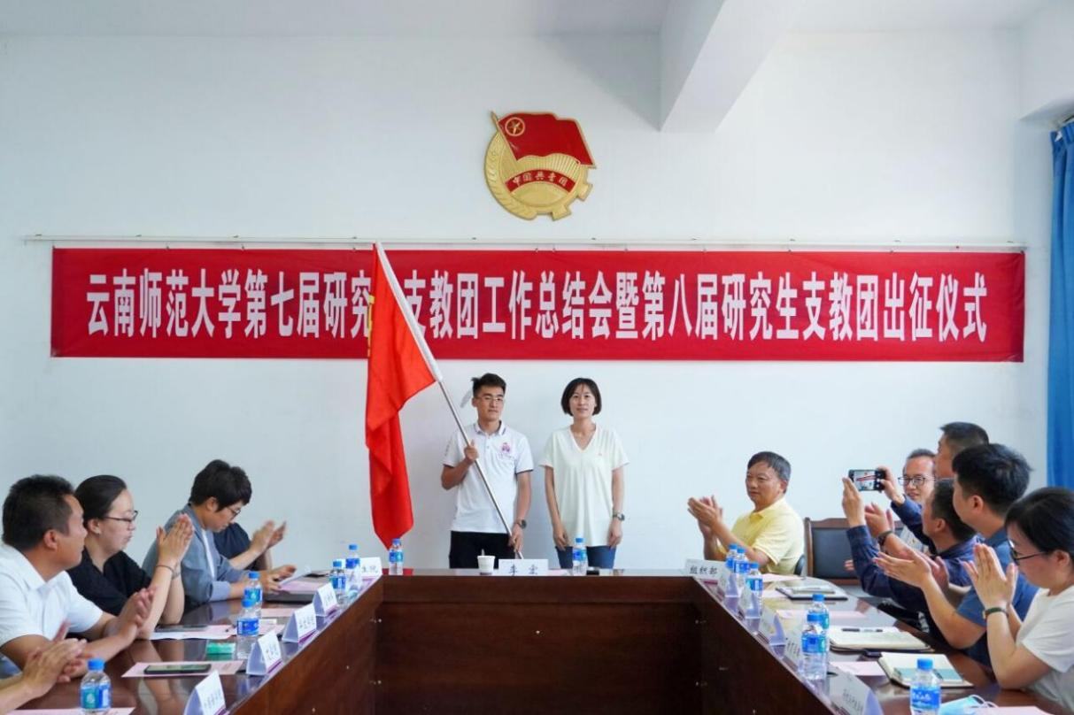 仪式上,校党委副书记李宏老师为第八届研支团授支教团团旗,校党委组织部副部长马春雨老师为第八届研支团授党旗,校团委副书记曹逸凡老师为第八届研支团授共青团团旗。