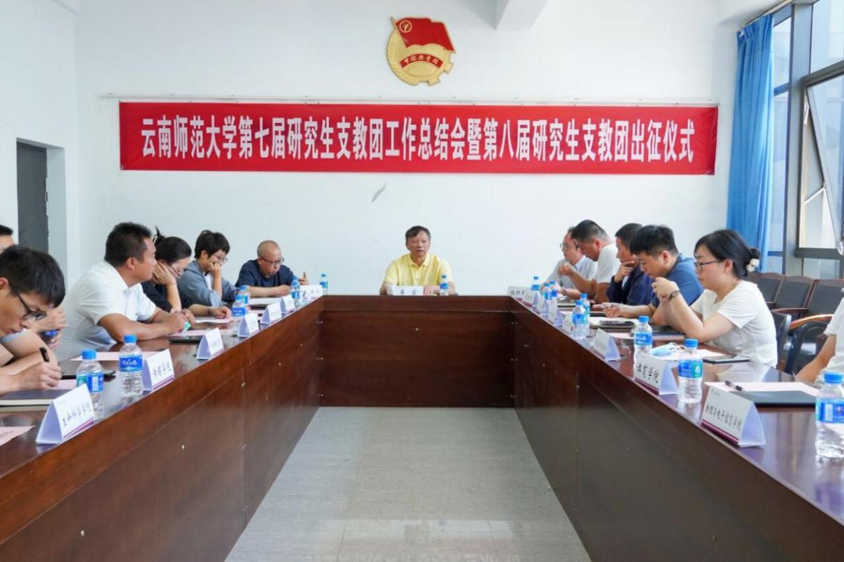 2022年8月29日中午,yL23411永利官网登录第七届研究生支教团工作总结会暨第八届研究生支教团出征仪式在呈贡主校区大学生活动中心209会议室举行。校党委副书记李宏,党委组织部、党委宣传部、研究生处、研究生院、学生处、对外合作交流处、校团委相关负责人,各学院(学部)党委副书记代表、团委书记代表,以及第七届、第八届研究生支教团全体成员参加活动。仪式由校团委书记郑伟俊主持。