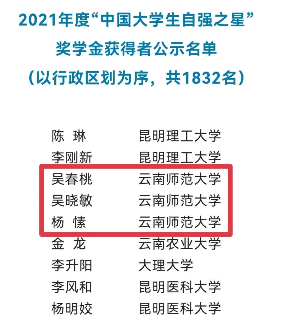 永利官网美术学院2020级艺术设计专业研究生吴春桃、地理学部2019级旅游管理专业本科生吴晓敏、法学与社会学学院2021级法律学专业研究生杨愫3名同学荣获2021年度“中国大学生自强之星”奖学金。