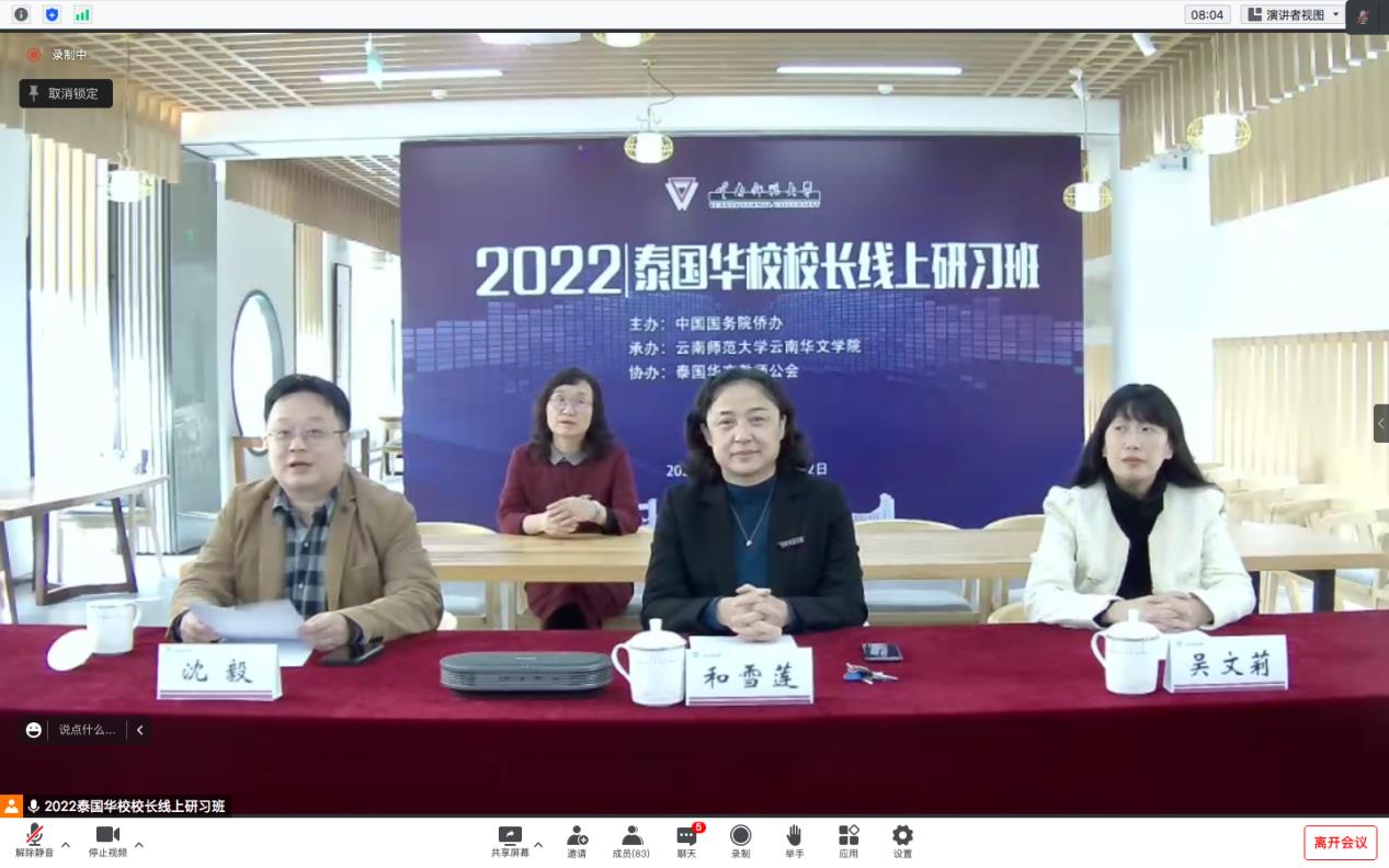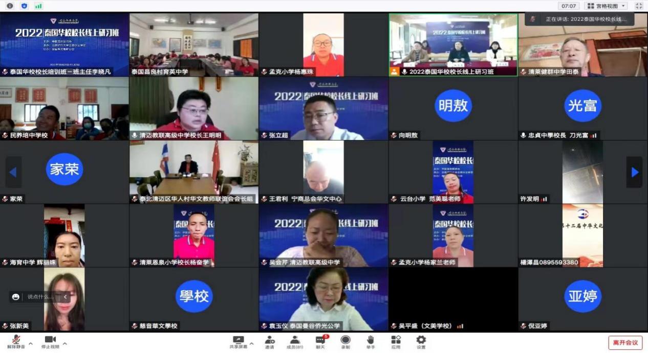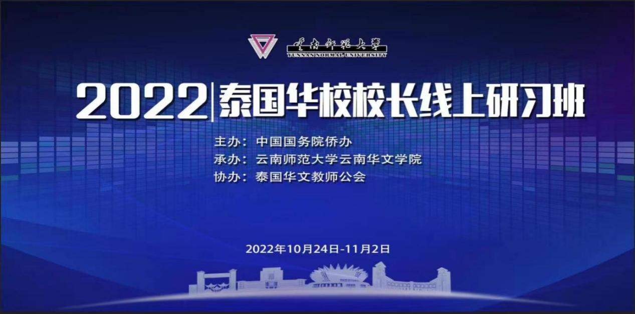 10月24日,由国务院侨办主办,yL23411永利官网登录云南华文学院承办,泰国华文教师公会协办的“2022年泰国华校校长线上研习班”在永利官网开班。云南华文学院党委书记和雪莲、泰国华文教师公会主席罗宗正、泰国泰北清迈区华人教师联谊会会长王相贤,来自45所泰国华文学校的181名参训学员以及云南华文学院相关院领导、班主任参加了开班仪式,汉语国际推广师资培训基地(昆明)常务副主任沈毅主持开班仪式。