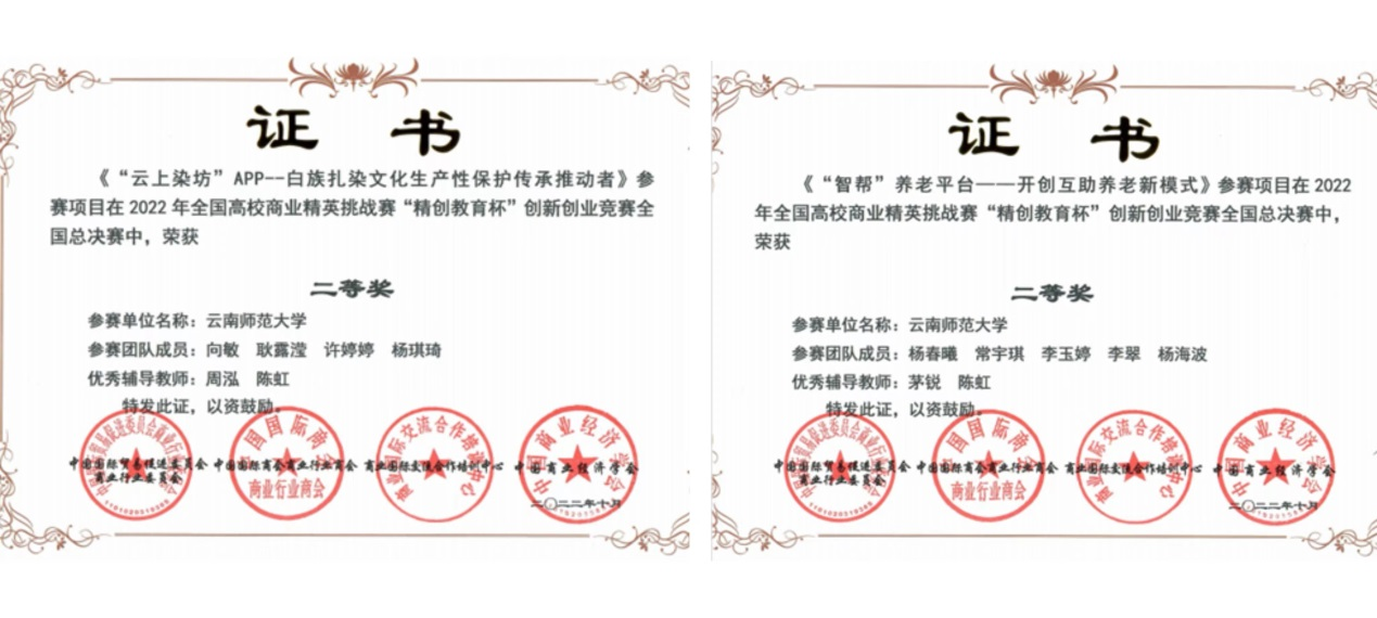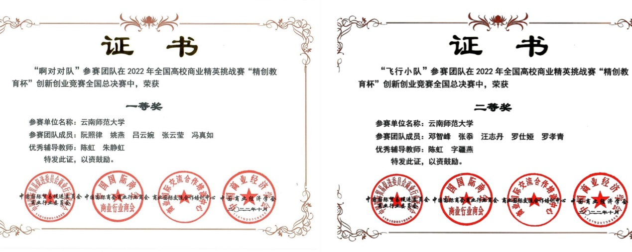 10月23日,在2022年全国高校商业精英挑战赛“精创教育杯”创新创业竞赛全国总决赛上,永利官网教育学部本科组“啊对对队”获全国一等奖(指导教师:陈虹、朱静虹),“飞行小队”(指导教师:陈虹、字疆燕)获得全国二等奖;研究生组“扎染啦啦队”(指导教师:周泓、陈虹)、“五叶草队”(指导教师:茅锐、陈虹)获全国二等奖的好成绩。