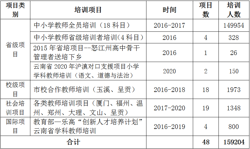 发展非学历教育,提升社会服务质量。学院以“夯实基础、突出重点、多点开花、循序渐进”为原则,在项目开发、课程建设、培训模式等方面进行改革,以培训需求为导向,按需施教、学用结合。积极参与并认真做好“国培计划”项目,2016年至2022年共承担国家级中小学幼儿园教师培训项目20项,培训全国骨干教师9491人,乡村教师19576人;承担全国科学教育暑期学校中小学教师培训,培训人数达29767人。与深度贫困县共同实施“国培计划”项目,共建示范区、共育示范校、共育示范团队,开展点对点实地教学指导,组织训后跟踪指导,变“输血式”扶贫为“造血式”扶贫,助力梁河县、镇雄县、泸西县等11个深度贫困县成功脱贫摘帽。