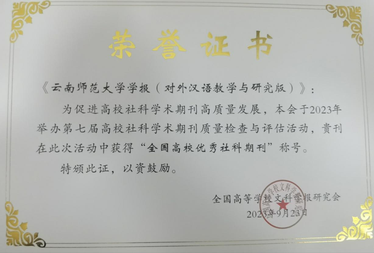 在全国高等学校文科学报研究会举办的第七届高校社科学术期刊质量检查与评估活动中,《yL23411永利官网登录学报》(对外汉语教学与研究版)被评为“全国高校优秀社科期刊”。