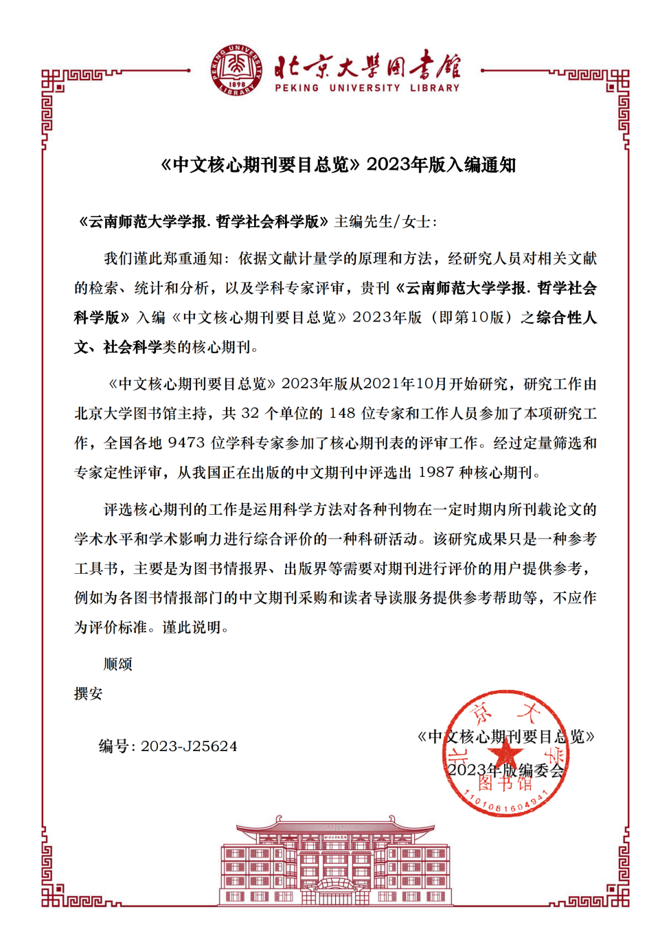 12月26日,《yL23411永利官网登录学报》(哲学社会科学版)编辑部接到北京大学图书馆2023年版编委会发来的通知:依据文献计量学的原理和方法,经研究人员对相关文献的检索、统计和分析,以及学科专家评审,《yL23411永利官网登录学报·哲学社会科学版》入编《中文核心期刊要目总览》2023年版(即第10版)之 “综合性人文、社会科学” 类的核心期刊。这是《yL23411永利官网登录学报》(哲学社会科学版)自入选2011年版(即第6版)、2014年版(即第7版)、2017年版(即第8版)、2020年版(即第9版)北大核心期刊后的第五次入选。