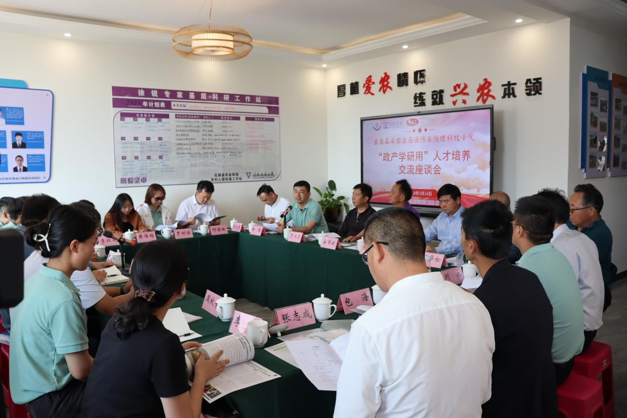 揭牌仪式结束后,徐锐主持召开了科技小院“政产学研用”人才培养交流座谈,与会人员围绕石屏县农业面源污染治理科技小院人才培养、科技创新、社会服务等方面的示范作用进行充分探讨。研究生代表张炳薪、周伦、周睿、周秋芳分别分享了自己在科技小院的学习、实践和成长经历;共建单位代表云南众科生物技术有限公司董事长董家宾、石屏县农村人居环境保护站站长浦江分别介绍了自己服务乡村振兴、助推产业发展方面的经验和见解;贾兴勇介绍了省级科技小院的作用和立项建设过程;李彦强调了科技小院在农作物秸秆综合利用中应发挥的作用;包海对科技小院的发展历程、建设标准做了详细介绍;骆华松介绍了学校在培养农业专业硕士的扶持政策和保障措施;黄雁梅介绍了省农业农村厅对科技小院建设的初衷和要求;能源与环境科学学院张勇教授作为科技小院入驻专家团队成员分享了科技小院建设的心得。