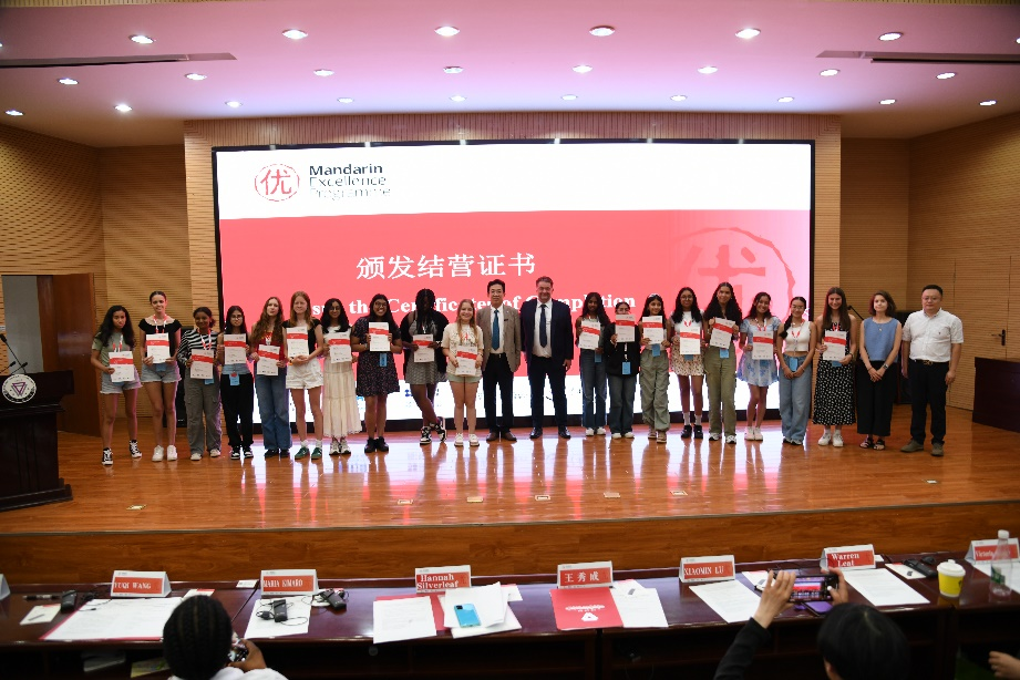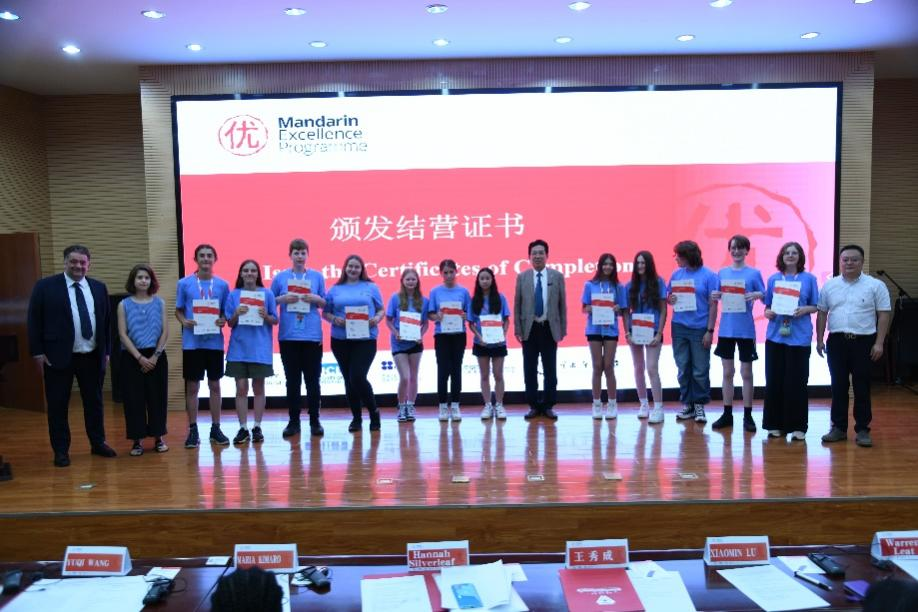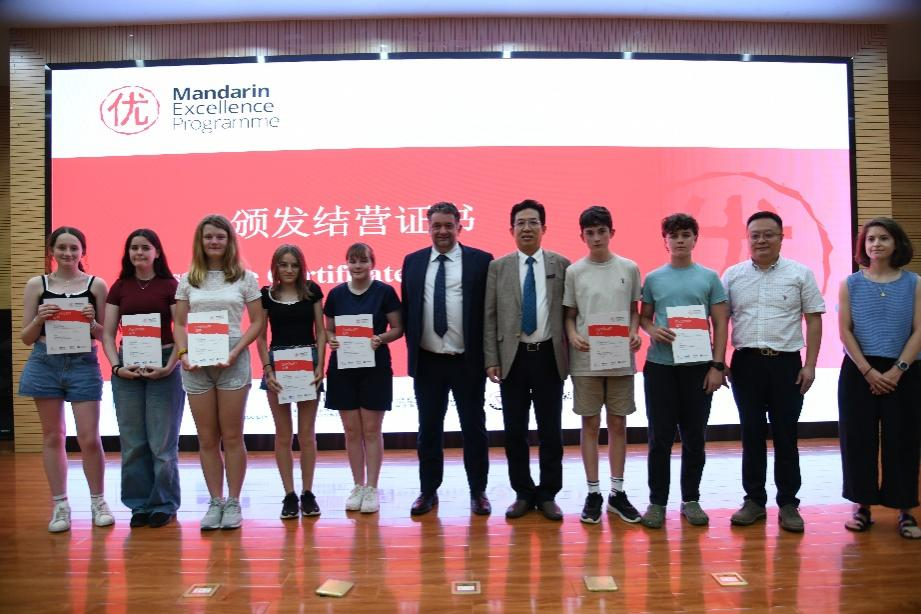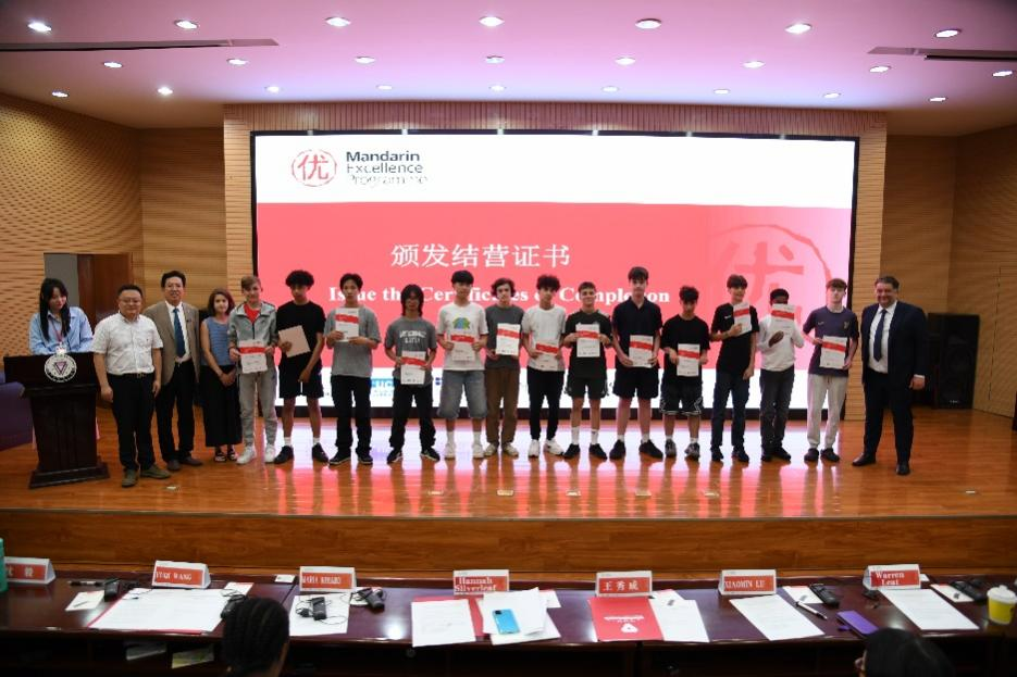 王秀成作总结发言,他认为本次“中文培优”来华夏令营课程内容与时俱进,具有时代感;活动精彩纷呈,充分给予中英学生学习交流机会;英国同学阳光向上,展现蓬勃生机。在夏令营中,英国同学积极与中国同学交流学习,将“你中有我,我中有你”的友好学习方式贯穿始终,展现了优秀英国青少年的青春活力。最后,他提出了三点希望:一是激活学习中文的热情,提高应用中文的能力;二是将学到的知识讲给更多的人,让更多人了解中国;三是欢迎同学们未来有机会能到中国学习,更加深入、长久地在中国学习和生活。
