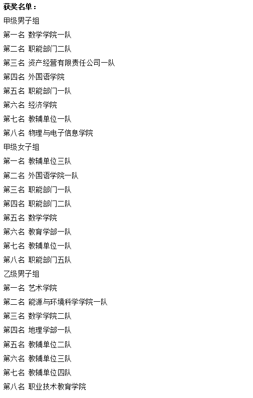 经过激烈角逐,甲级组数学学院一队获男队第一名,教辅单位三队(图书馆、心理中心)获女队第一名;乙级组艺术学院获男队第一名,地理学部获女队第一名(具体获奖名单附后)。