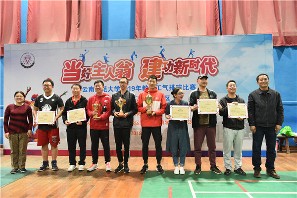 本次参赛队伍由在一二•一西南联大校区的学院、部门二级工会及特邀师大附中、师大实验中学、云南民族中学、附属世纪金源学校、师大附小等18支队伍组成。比赛历时4天,共63场比赛。过去四天,整个场馆里撒下了运动员们的汗水,也洋溢着前来助阵的老师们的呐喊声、欢呼声。参加比赛的队伍支支斗志昂扬、队员个个摩拳擦掌,每一场比赛都激烈异常、精彩纷呈。比赛过程中,每个队员都尽力发挥,将个人的球技与团队合作相结合,发球、接球、传球、扣球一气呵成,娴熟的球技与完美的团队合作赢得场下观众的阵阵喝彩。此次比赛中,各参赛队伍秉承着“友谊第一,比赛第二”的高尚精神,尽管赛场上比拼得不可开交,但是比赛结束后,比赛双方都面带微笑,亲切握手、互相鼓励。