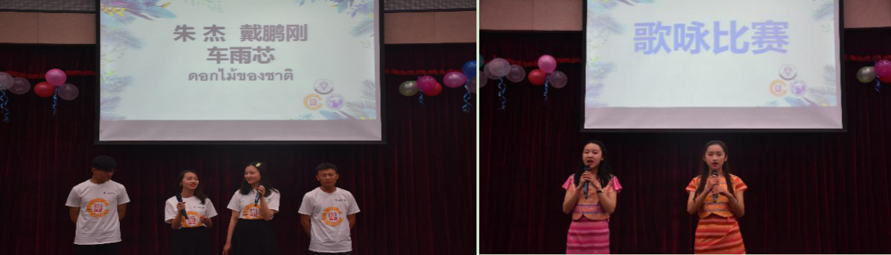 在305报告厅进行的是泰语歌咏比赛。伴随着泰国乐曲选手们边歌边舞,有参赛者还用中国古典乐器琵琶演奏泰国背景音乐,不时引来观众们的掌声,精彩连连。最后,一等奖由朱杰四人组以及普爱双人小组获得。