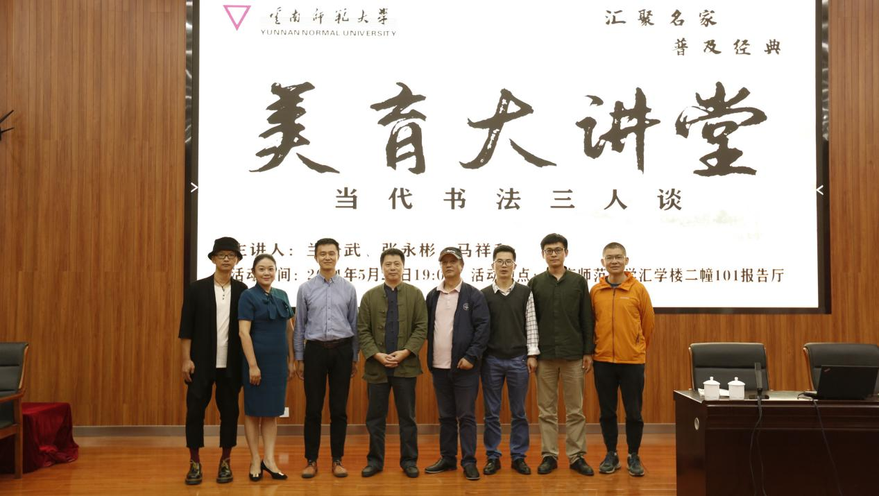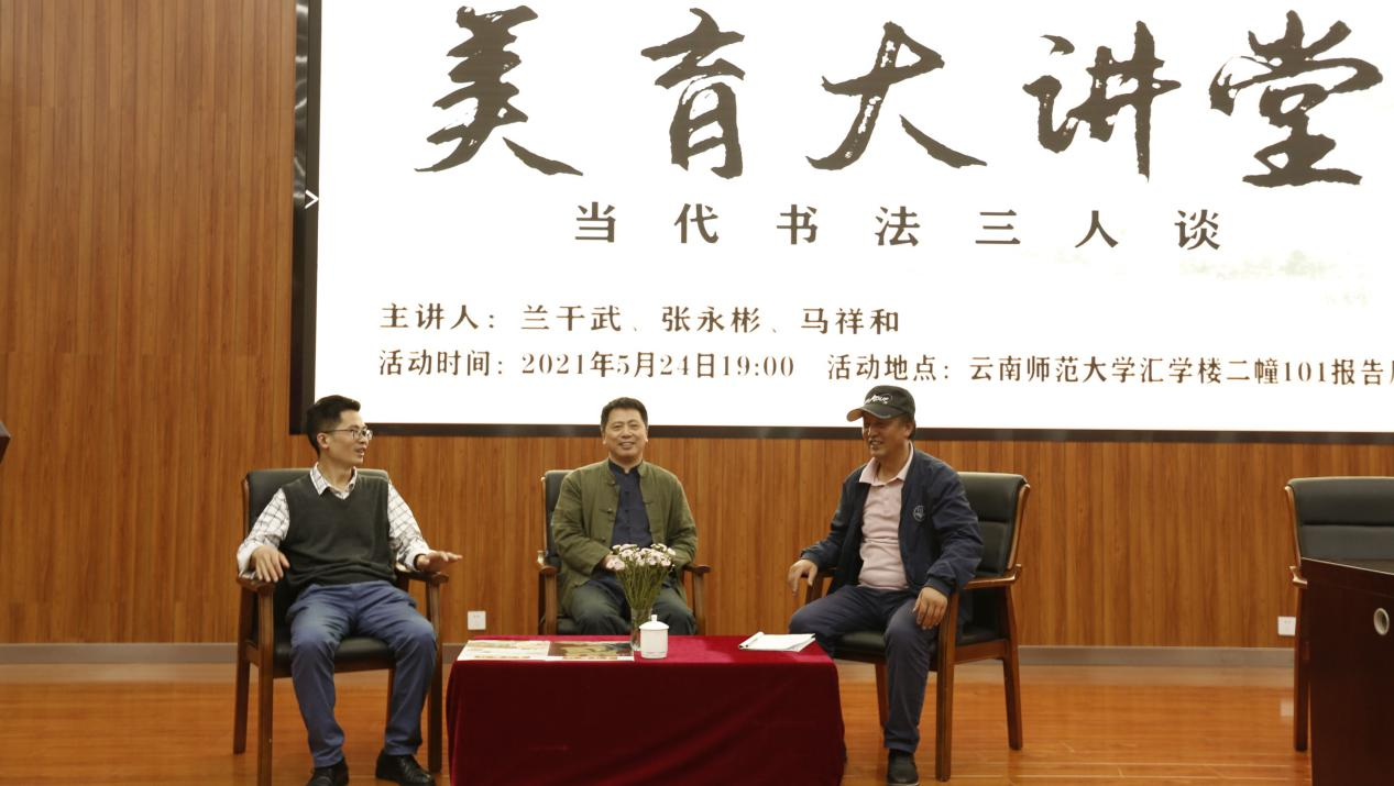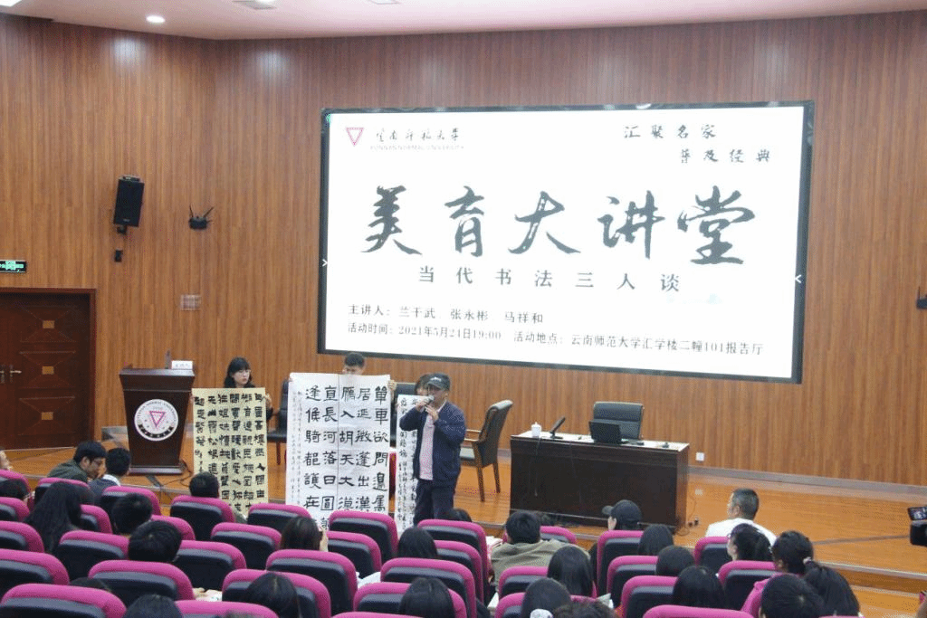 5月24日晚,在汇学楼二幢101报告厅迎来了第四期“美育大讲堂”“当代书法三人谈”活动。本期由科学技术处主办,邀请兰干武、张永彬、马祥和三位老师担任主讲嘉宾,音乐舞蹈学院李孟璇老师担任学术主持,呈贡校区各学院(部)师生、科学技术处相关人员共500余人参加。