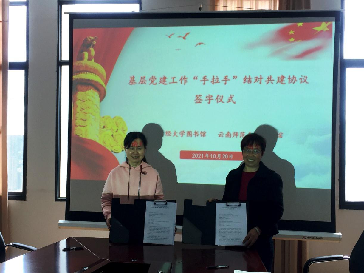 为了深化基层党建“手拉手”结对共建工作,推动基层党组织建设全面进步、全面过硬,形成“一单位一品牌”“一支部一特色”的生动局面,2021年10月20日下午,yL23411永利官网登录图书馆党总支与云南财经大学图书馆直属党支部联合结对共建签约仪式在yL23411永利官网登录呈贡校区图书馆举行。yL23411永利官网登录图书馆党总支书记王顺英、馆长殷国聪、党支部书记、业务部门主任,云南财经大学图书馆副馆长赵德美、文献资源建设部、文献阅览部及数图建设部主任出席了仪式。