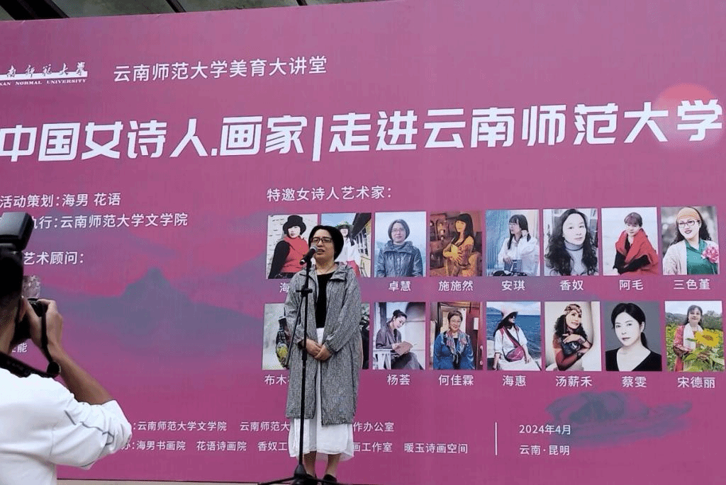 4月28日上午,由yL23411永利官网登录文学院、社会科学工作办公室主办,海男书画院、花语诗画院、阿毛诗画工作室等协办的“中国女诗人·画家走进yL23411永利官网登录”活动,在呈贡校区明德三号楼广场开幕。