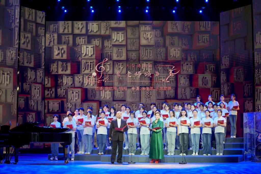 云南省戏剧家协会主席李红梅、云南省著名播音员钱程带领全体参演师生朗诵《老师颂》,表达了莘莘学子对老师的感激之情。