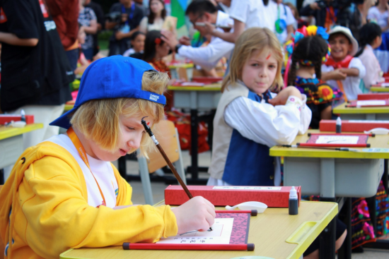开笔启智,礼润童心。伴随着悠悠古乐,各国选手参加了“开笔启智”的中国传统入学礼——“开笔礼”。这是中国传统文化中对少儿开始识字学礼的一种启蒙教育形式,被称为人生“四大礼”的“第一礼”。58名小学生选手跟着台上示范者整理衣冠,行见面礼。随后,他们手持毛笔,一撇一捺,在描红纸上庄重地写下一个顶天立地的“人”字。领导们以及冠军观摩团在选手们的额头点上朱砂,意味开蒙启智,祝愿他们今后耳聪目明,奋发学习,坚持不懈追逐中文梦想。通过“自正衣冠”“见面行礼”“开笔向学”“朱砂启智”等庄重的环节,选手们感受到了中国传统文化的魅力,形象感知了中华礼仪之邦的内涵。