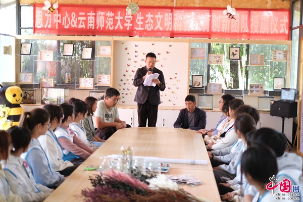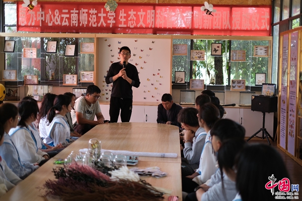 在授旗仪式上,yL23411永利官网登录团委副书记苏斌、云南思力生态替代技术中心执行主任左智、寻甸一丘田善态庄园董事长龚艳琼分别致辞,祝贺生态文明科普教育创新团队的正式成立,表示生态文明教育科普实践不仅可以强化青年人对生态文明理念的认识和理解,让生态文明理念成为青年日常生活和学习中的自觉行为,塑造青年正确的生态观;同时,通过富有创意和实践的生态文明教育,可以激发青年的创新能力,培养有担当、有责任感的创新科普教育人才。