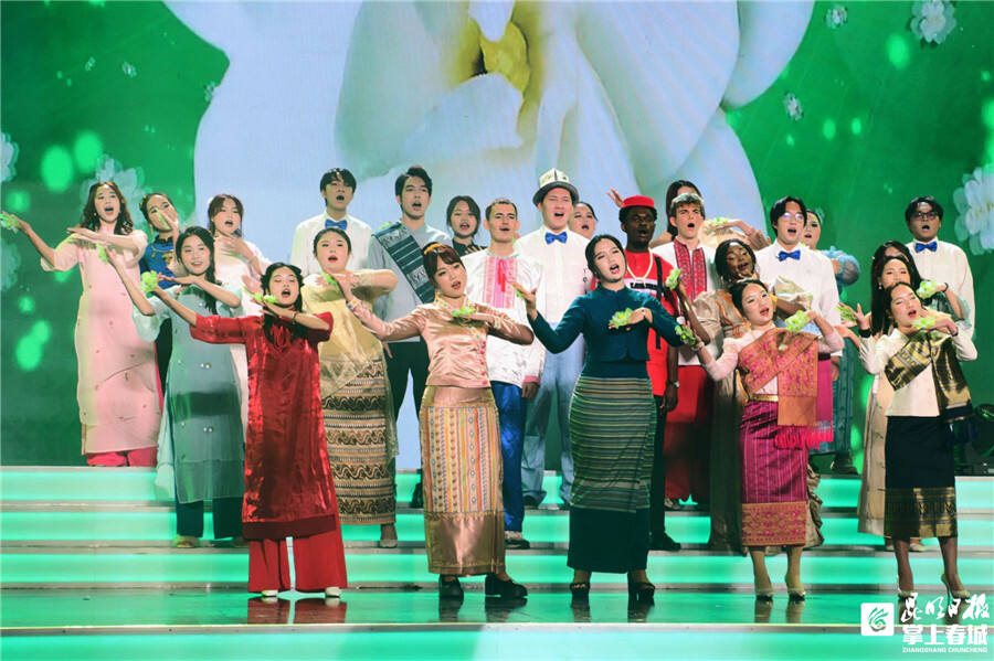 由来自12个国家60余名中外学生组成的云师“和声国际”合唱团带来歌曲《茉莉花》。合唱团成员乌克兰籍国际学生阿尔特姆说:“希望我们的演绎能够给观众带来温暖。练习的过程中,我们不仅感受到了这首歌曲表达出来的美好意义,结下了深厚的友谊,也加深了对中国文化的理解。”泰国、乌克兰、越南、缅甸等国的36名留学生带来舞蹈《“一带一路”·歌舞相和》。缅甸籍国际学生陈志雄说:“很多云师人投入到教育事业中,我很敬佩这些扎根基层工作的老师。在他们的鼓舞下我会在新的一年里继续努力成为更优秀的自己。”