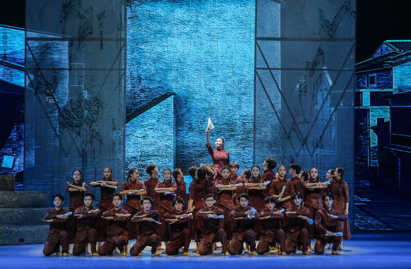 与歌声绕梁同步的舞蹈表演,最令人难忘的是每一段群舞结束造型定格时,上方都分别耸立着高举的拳头、马灯、课本,象征坚强的意志、光明和希望以及知识的力量。整个剧目中古典舞、民间舞、芭蕾舞自然融汇,每组舞者的空间灵巧切换,与剧情需要十分吻合。