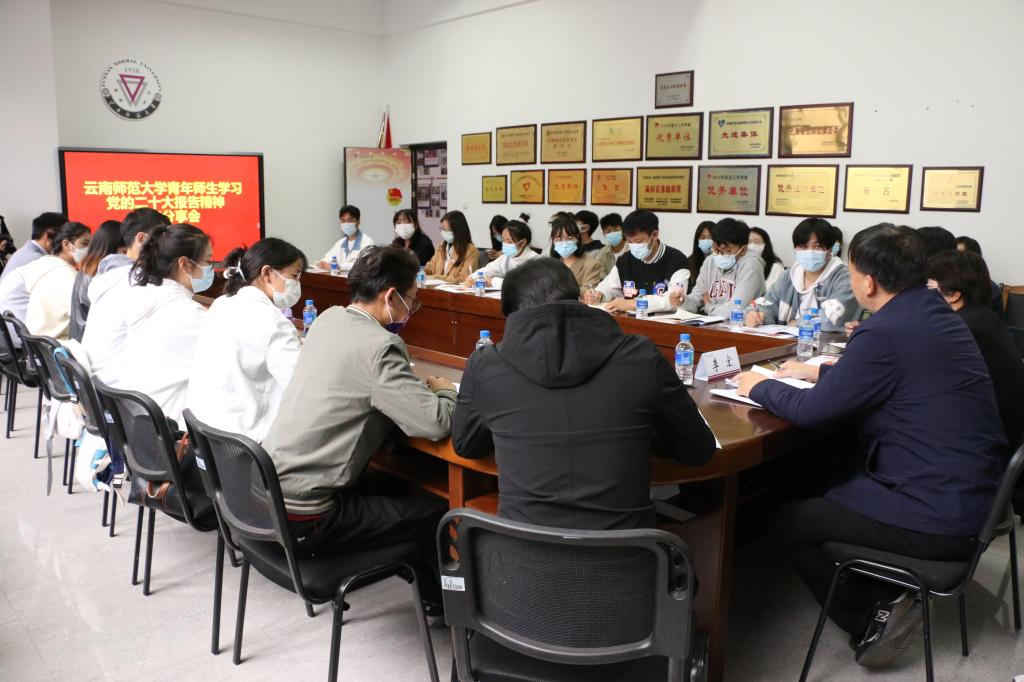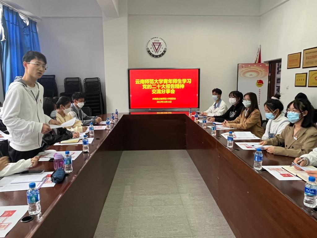10月16日下午,由校党委宣传部指导、校团委组织的yL23411永利官网登录青年师生学习党的二十大报告精神交流分享会在呈贡主校区大学生活动中心会议室举行,校党委李宏副书记参加分享会并讲话,校团委书记郑伟俊主持活动。